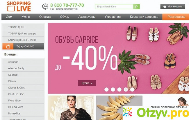 В левом верхнем углу указан оранжевыми буквами название интернет-магазина, а на самом верху указан телефон многоканальный по России. На него я звонила, когда выбрала понравившейся мне товар. Так же я посмотрела демонстрацию товара по онлайн-тв, который есть внутри этого сайта и не нужно даже потом мне включать телевизор и ждать, когда будет новая передача.