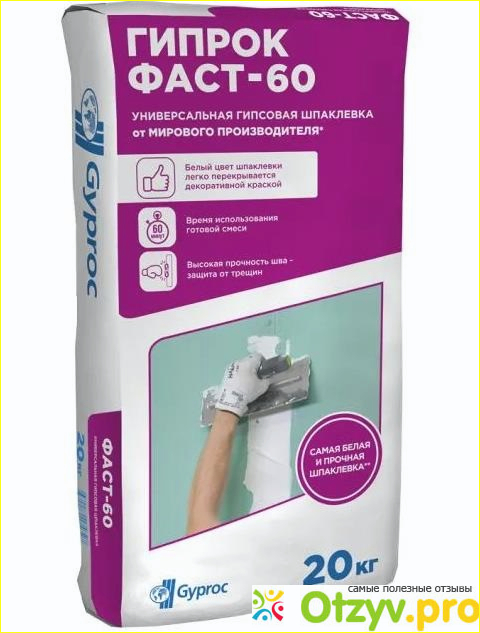 Кроме этого, у Гипрока так же есть шпаклевочные смеси, они необходимы для заделки стыков между листами гипсокартона, для шпаклевания неровностей. Одна из таких смесей, это гипсовая шпаклевка Fast 60.