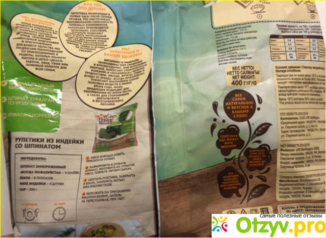 Состав как всегда, только шпинат, много информации на пачке. Особенно повеселил вопрос «Как мы это делаем?» Вот мне тоже интересно, ребята. Как вы это сделали? Единственная заморозка, которую нереально испортить, а вы умудрились!!! Молодцы, что сказать.