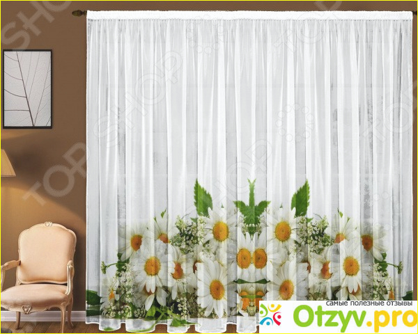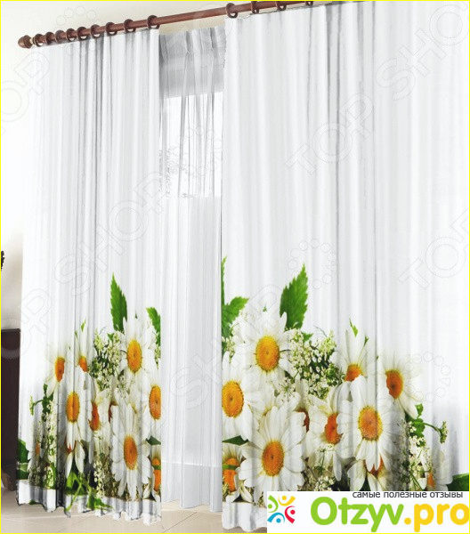 Дизайн данных штор действительно привлекательный, симпатичный и достойный внимания. Шторы белые, а низ их украшает красивый принт из больших ярких ромашек. Таким образом, акцент идет не только на окно, но и на пол, где непроизвольно акцентируешь внимание на яркую картинку, которая переходит в пол. Действительно штора достаточно яркая и симпатичная, привлекает внимание и вызывает восторг не только у тех кто ежедневно ее наблюдает, но и у тех кто приходит погостить.