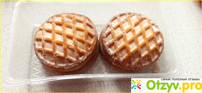 Внутри упаковки находится довольно плотный прозрачный пластиковый контейнер с четырьмя круглыми печеньками, прям как на упаковке, посыпанными сахарной пудрой, а аромат - просто обалденный.