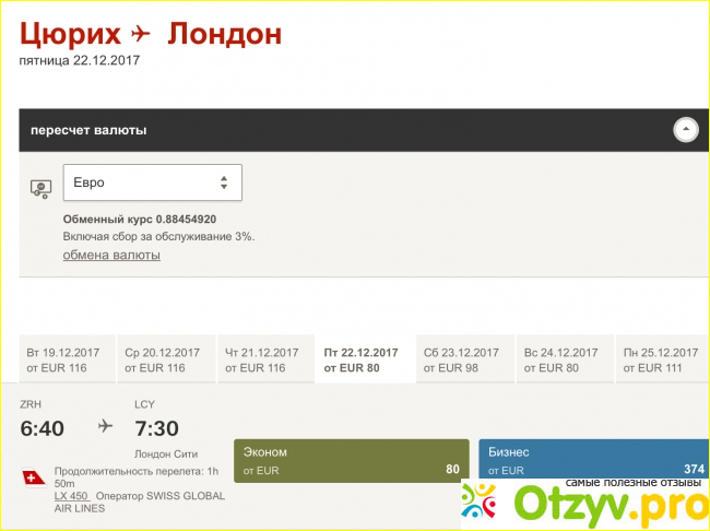 ЦеныЦены данной компании не самые дешевые и есть направления, на которые очень даже дорогие, например, цена в Лондон 80€, а вот чтобы вернуться из Лондона в Цюрих надо выложить не меньше 200€. Если вы, как и я предпочитаете бюджетный отдых, во всяком случае если есть возможность сэкономить на дороге, то этот вариант совсем нам не подходит.