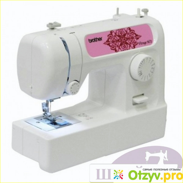Внешний вид данной модели довольно приятный (цвет белый с розовой отделкой). На предней панели находится переключатель натяжения нити и кнопка реверса.