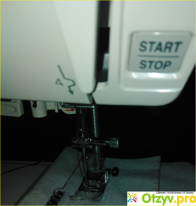 Фирма японская, но изготавливается в Китае. Эта швейная машина компьютеризованная. Может работать как с помощью ножной педали, так и просто от кнопки от электричества. На корпусе есть кнопка СТАРТ/СТОП. С её помощью можно начать шить или остановить машину.