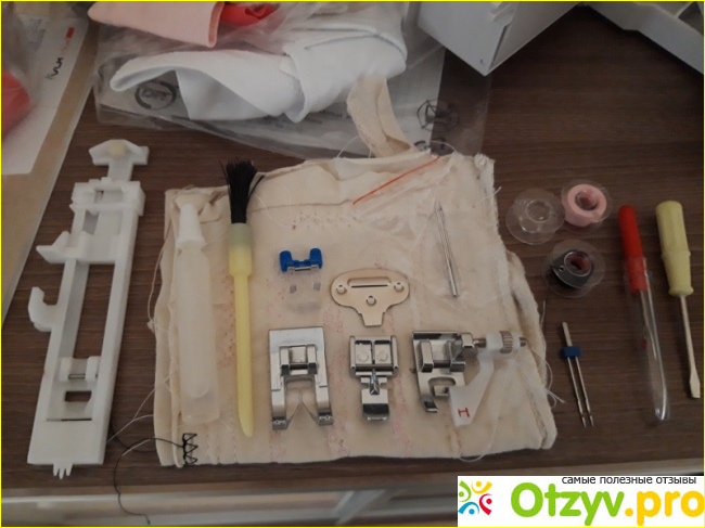 Нить наматывается автоматически, в конструкции есть автоматический нитевдеватель. Машина сама пришивает пуговицы, а при необходимости можно вшить замок "молнию": для этого есть специальная лапка, выполняющая эту операцию.