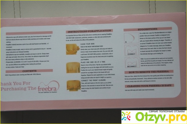Ходила я, однажды, по ЦУМу и увидела этой чудо бюстгальтер фирмы Freebra. Сначала я вообще не поняла, что это, потом продавец меня проконсультировал, и все стало более-менее понятно. Он был изготовлен из силикона, на ощупь мягкий, клейкая середина, наверху с пленкой, чтобы можно было прикрепить на грудь. Существует телесного и черного цвета. Я взяла телесный, он точно под все подойдет, люблю универсальность. Комплект состоит из самого бюста и прозрачных силиконовых бретелей, которые мне так и не понадобились.
