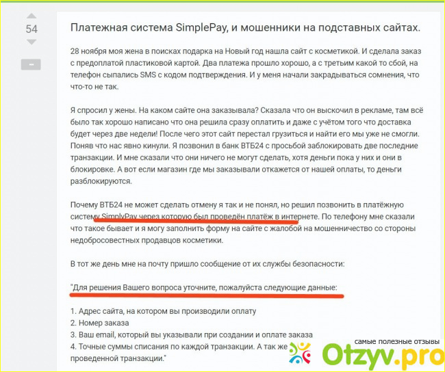 Техническая поддержка – отдельный пункт. На развлекательном портале PIkabu есть целый разоблачительный пост о девушке, которая заказала посылку через интернет-магазин, используя данный сервис, работающий с электронными деньгами. Естественно, оплата не прошла, ее муж позвонил в техническую поддержку Simplepay pro, которые заявили, мол «бывает», а затем предложили написать заявление на возврат денежных средств от мошенников. То есть воспользоваться той самой системой, которые расхваливали пользователи на Отзовике.
