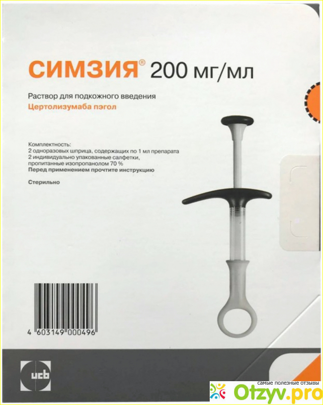 Итак, герой моего обзора препарат Симзия – иммунодепрессант, в его составе содержится активное действующее вещество цертолизумаба пэгол в дозировке по 200 мг, выпускается в форме раствора для подкожного введения, она прозрачного цвета. Именно данное вещество и относится к ингибиторам фактора некроза опухоли альфа, который широко используется при лечении аутоиммунных патологий, например: ревматоидного артрита, болезни Крона, псориатического артрита и тому подобных заболеваний. Далее мы подробно разберем при каких именно болезнях рекомендуется принимать Симзия.