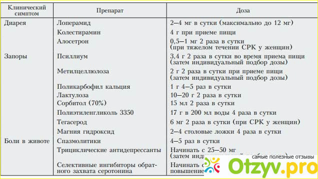 4) Медикаментозное лечение СРК сводится к выбору препарата в соответствии с симптомами. При спазмахпазмолитики – помогают уменьшить боль и убрать спазмы спазмалотики, при запорах - слабительные, при поносе - противодиарейные и еще антидепрессанты.