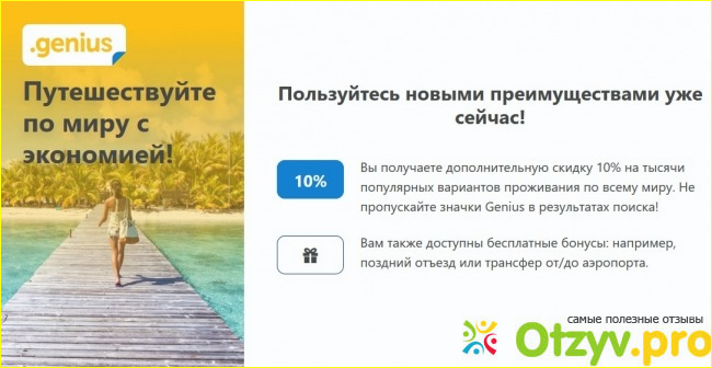 Опция Genius позволяет получить десятипроцентную скидку на тысячи номеров в гостиницах и других местах проживания, которые на сайте отмечены маркой Genius. Кроме того, в этих отелях вам предоставят бесплатный транспорт из аэропорта и в аэропорт, а также возможность более позднего освобождения номера.