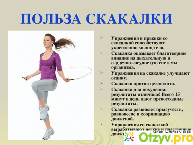 Прыжки на скакалке являются прекрасной кардиотренировкой. Регулярно занимаясь со скакалкой можно существенно увеличить свою выносливость и получить отличную физическую форму.