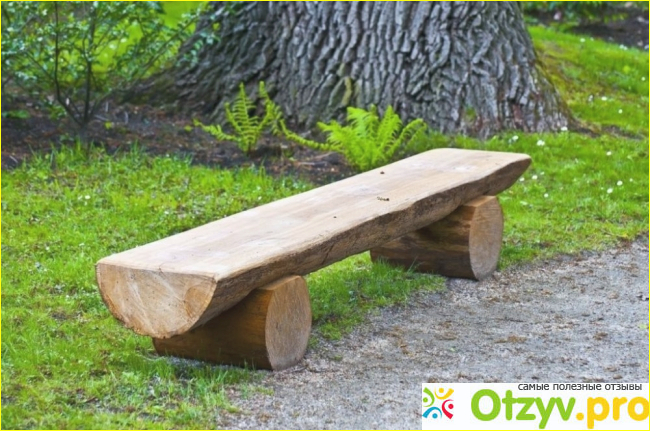 Достоинство данного изделия в том, что оно собрано своими руками. Второе достоинство – это необычный вид. Недостаток только один. Вес скамьи не позволит легко переносить изделие с места на место. Поэтому лучше всего определить скамье постоянное место жительства, например у костра.