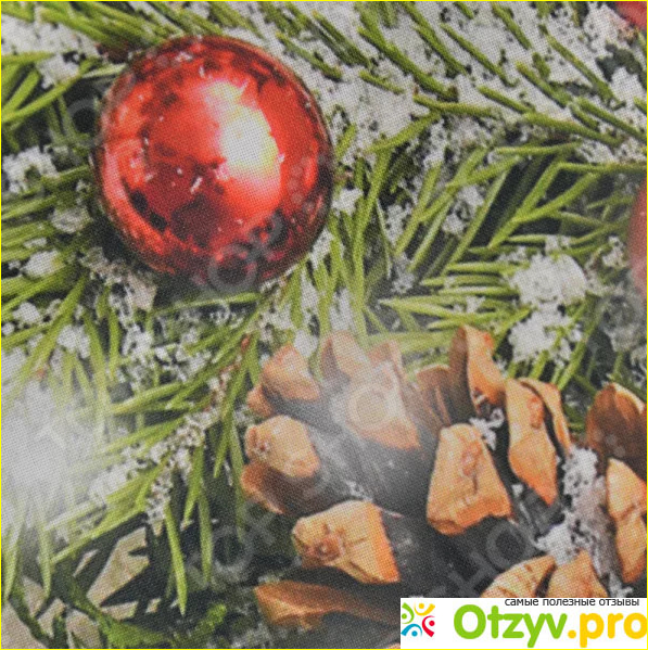 Рисунок данной скатерти выполнен в гармоничных не броских тонах. Расположен он тоже довольно таки интересно. В середине узор мелкий, не броский, сами тона светлые зеленовато-пастельные. По краям же стола начинается, пожалуй, самая декоративная часть данной скатерти - невероятно красивые теплые еловые веточки с шишечками (откуда и название данной скатерти), новогодними шариками и ягодами красного цвета. На столе данная скатерть выглядит по современному торжественно и, разумеется, украсит собой любой интерьер, придав всем гостям и хозяевам дома поистине праздничное приподнятое настроение.