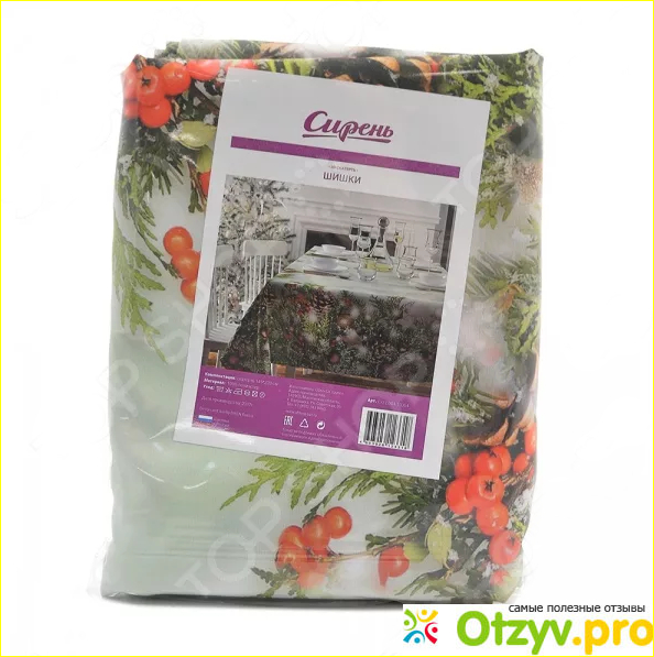 Что касается самого материала, из которого изготовлена данная скатерть, то это сто процентов полиэстер, как гласит надпись на ее этикетке.