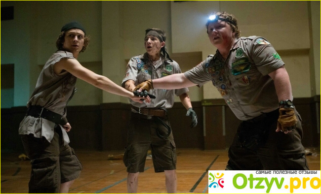 в кратце этот фильм про трех друзей бойскаутов и обезбашенную разносчицу коктейлей которым предстоит противостоять огромной армии разъяренных зомби которые постоянно пытаются их покусать а им в свое время приходится спасаться бегством, прятаться, и защищатся различными подручными средствами. при всем этом один из героев фильма не теряется и делает селфи снимки с зомбаками себе на аватар.