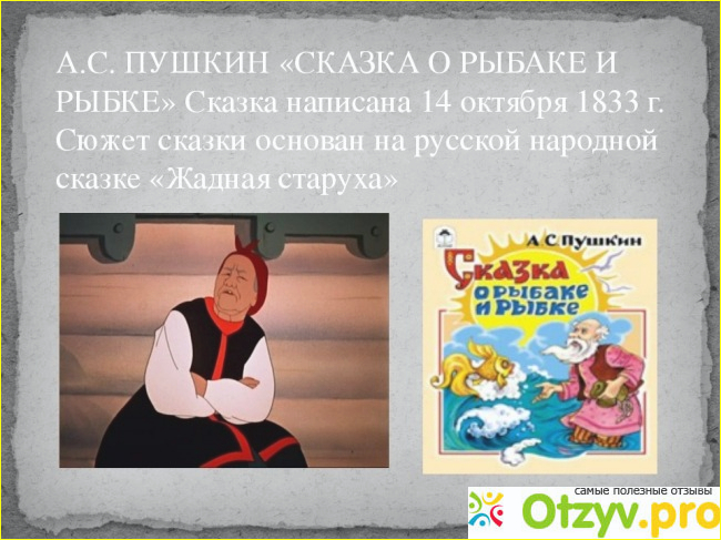 На протяжении повествования состояние моря постоянно меняется от спокойного, до черного, находящегося в шторме. Также и меняется настроение старухи с каждой своей просьбой она все больше ненавидит старика. У нас и сейчас в ходу сочетание "остаться у разбитого корыта", как признак того, что в погоне за большим можно лишиться всего. На сегодняшний день сказку постоянно печатают как самостоятельное произведение для детского чтения, ее ставят в театре, снято несколько мультиков. Колоссальный успех этого истинного шедевра навсегда запечатлен в памяти народа. И не важно, кому именно принадлежит основная идея. Мы навсегда будем помнить именно Пушкина как создателя.