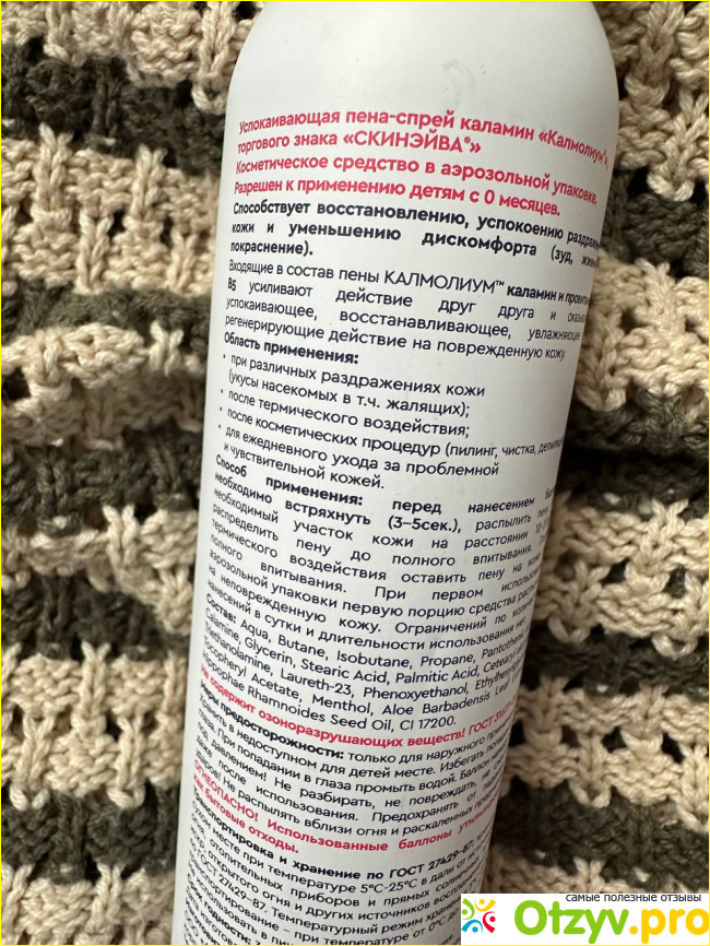 Каламин даёт приятный нежно-розовый оттенок пенке. Она не оставляет следов на коже, на финише нет липкости и другого дискомфорта. Наносить её очень удобно на повреждённые поверхности кожи. Можно аккуратно распылить и не трогать кожу руками, просто дать впитаться самостоятельно. Это исключает риск присоединения бактериальной инфекции. Калмолиум всегда есть в домашней аптечке, так как применяем его всей семьёй (укусы насекомых, ожоги, микроранки кожи, ...). При поездках на дачу и в отпуск брала ещё один, цена позволяет, не бьёт по карману.