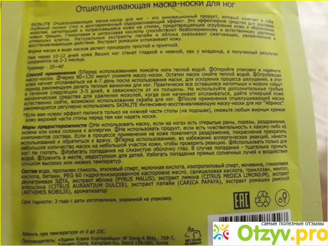 Внутри носочки, наполненные жидкостью, которые в принципе, от Сосу ничем не отличаются. Держать на ногах их нужно 1-2 часа. Нужно помнить и мерах предосторожности: не надевать носочки, если на ногах есть ранки, порезы. Если необходимо, чтобы кожа слезла только на стопах, можно остальные места смазать жирным кремом. Я держала носки один час. Никаких неприятных ощущений во время использования у меня не было. И точно так же, как и после Сосу, кожа начала слазить у меня на 4-е сутки. К концу недели слезла полностью и ножки стали чистые и гладенькие. Поэтому теперь я перешла на носочки марки Скинлайт.