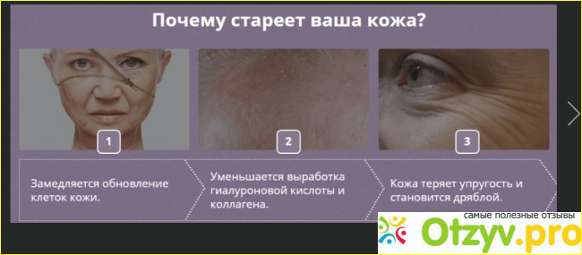 Препарат не только устраняет морщины, но и еще останавливает причину старения кожи, ускоряет выработку коллагена, гиалуроновой кислоты.
