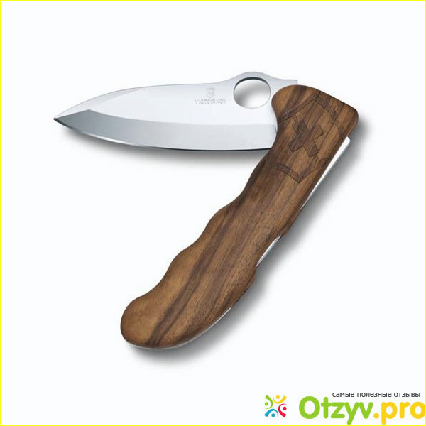 Открывать нож удобно с помощью петли, закрыть одной рукой тоже, в принципе, можно но надо приловчиться. Клинок широкий, толстый, надёжный. Рукоять удобная, обтекаемой эргономичной формы, в руке лежит отлично, но толстовата: целых 18 мм толщиной. На рукоять нанесена гравировка фирменного креста Victorinox. Материал — ореховое дерево. Видел несколько ножей рядом, действительно узор неповторимый, видно что дерево натуральное.