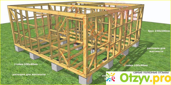 Стойки по углам и промежуточные из брусьев 150 на 150 мм, сверху и снизу сделали укосы: (это небольших размеров бруски или доски отходящие от промежуточных и угловых стоек в разные стороны, как снизу, так и сверху.