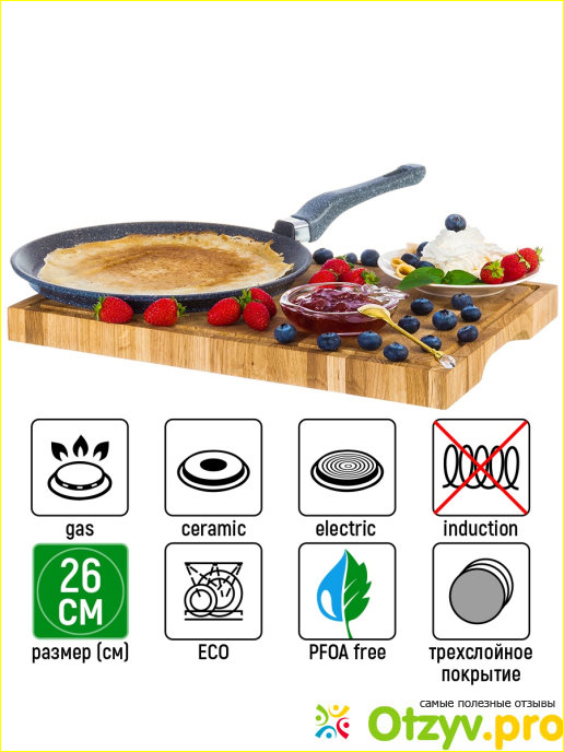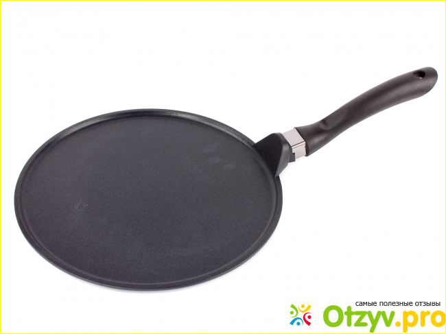 Эта сковорода на все тысячу процентов приспособлена под готовку блинов. Ее ручка сделана из специального материла, до которого удобно дотрагиваться во время приготовления блинов.