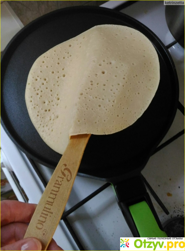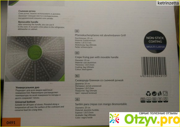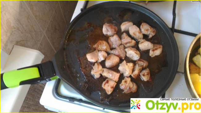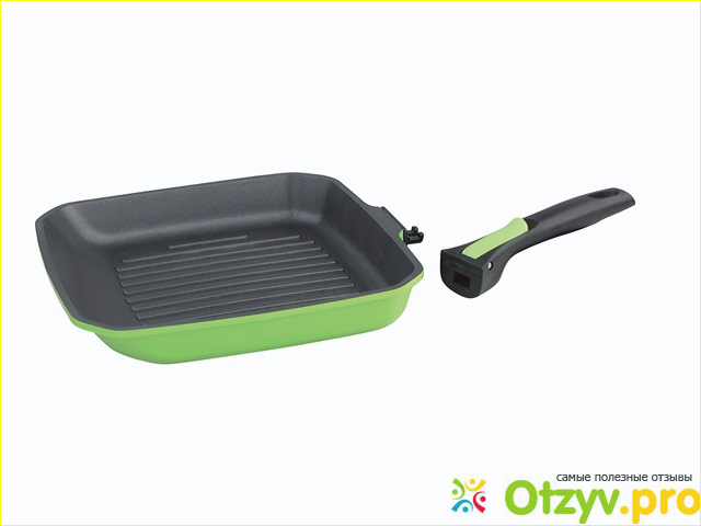 Как только увидала сковородку, да еще с отнимающейся ручкой (делается это одним щелчком и не нужны отвертки и винтики-шпунтики), так сразу в нее влюбилась, пользуюсь полтора года, покрытие на дне моей красавицы (яркий зеленый цвет с черным) совсем не притерпело изменений.