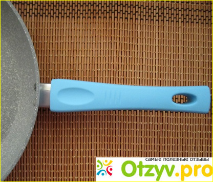 Ручка у нее позитивного голубого цвета, не снимается, но удобная и не нагревается в процессе приготовления на моей газовой плите.