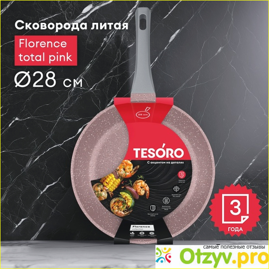 Решили приобрести сковороду фирмы Тезоро, из толстого алюминия с антипригарным покрытием. Привлеклись на интересную расцветку, необычно для сковороды розовый цвет. Сразу бросается в глаза.