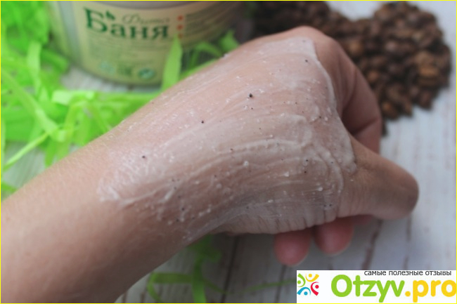 Консистенция скраба приятная, нежная и кремо образная, в нем много содержится крупинок кофе.