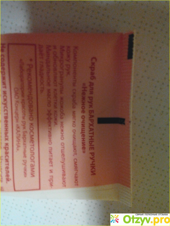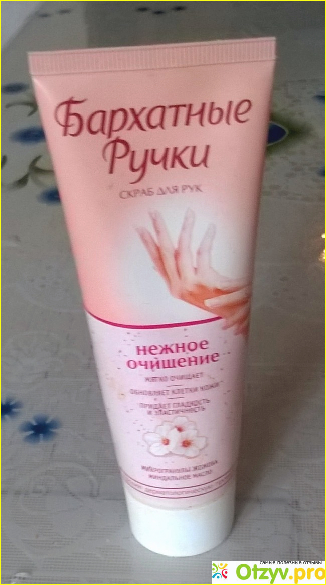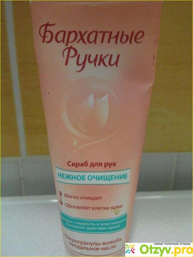 Упаковка обещает, что скраб очищает и обновляет клетки кожи, смягчает, делает кожу гладкой и нежной, а также усиливает действие обычного крема для рук.