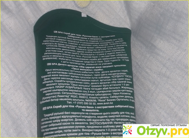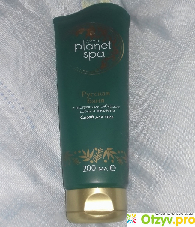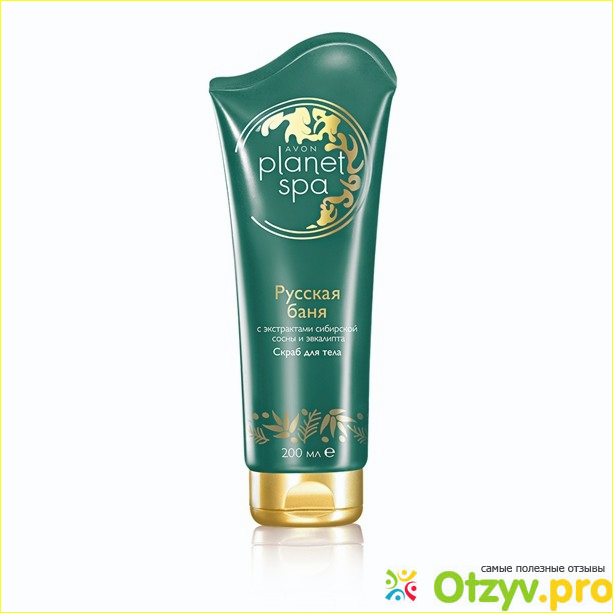 Выпускается скраб для тела Avon Planet Spa "Русская баня" в тюбике темно-зеленого цвета, на котором изображен золотистый кружок, в котором написана марка и серия косметических средств.