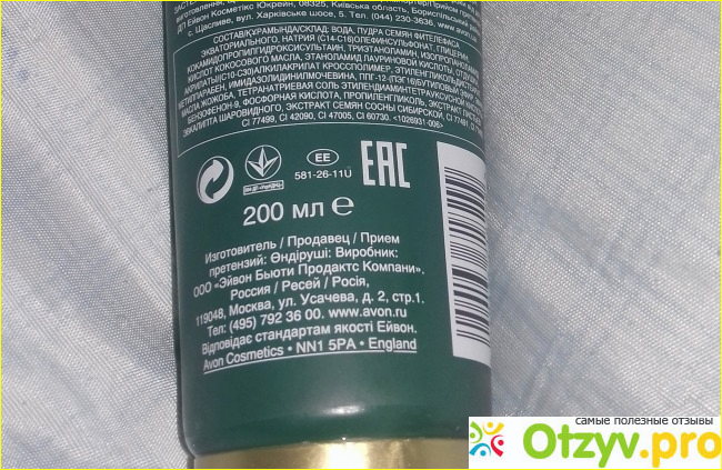 По низу тюбика нанесены золотистые узоры в виде листиков эвкалипта и веточек сосны, рядом с веточками сосны изображены то ли шишки, то ли семена сосны. Под узорами нанесен объем данного тюбика со скрабом, а именно двести миллилитров. Вот такой солидный тюбик получается.