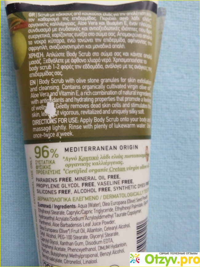 Этот скраб имеет очень удобную практичную крепкую упаковку. 200 мл. На центральной части флакона в самом низу указано, что продукт на 96 % натуральный.
