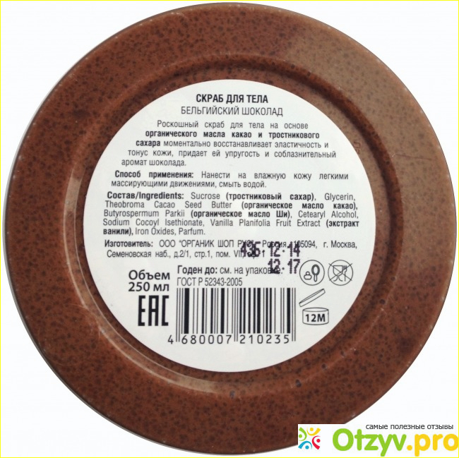 На крышке и на дне можно увидеть всю необходимую нам информацию о скрабе (состав, срок годности, объем и т. д.).
