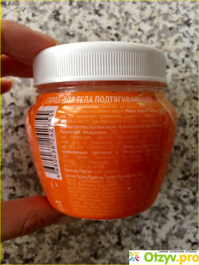 Баночка устойчивая, удобная, приятно пользоваться. На упаковке есть ряд информации, которая может пригодиться потребителю. Для начала хочу рассмотреть состав, в котором есть растительные компоненты, положительно влияющие на состояние кожи тела. Конечно же есть химические компоненты, они в большом количестве, но после использования могу сказать, что ничего негативного коже они не принесли. Есть информация о сроке годности и уточнение, что данный скраб после первого применения нужно полностью использовать за 12 месяцев. Для полной информативности есть адрес производителя, также потребителю пригодится знание правильного использования скраба.