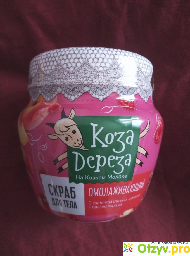 Скраб Коза Дереза для тела, омолаживающий, с косточкой малины, граната, с маслом персика. Написано, что средство сделано на основе козьего молока, но цвет его об этом явно умалчивает.