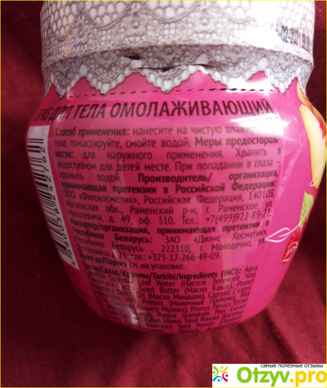 На упаковке отмечено, что скраб способен сделать кожу невероятно молодой, повышает её упругость, эластичность, тонизирует, очищает, имеет лифтинг эффект.