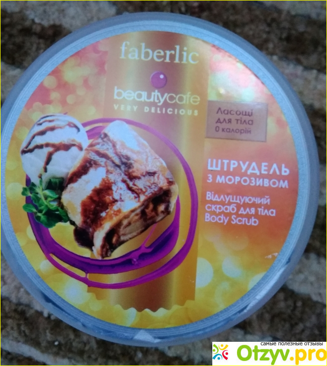 Он имеет приятный запах, выполняет свои функции и преображает кожу. Это Скраб под сладким и вкусным названием- "Штрудель с мороженым" . Выпускается торговой маркой Faberliс. А cерия - "Beauty Cafe".