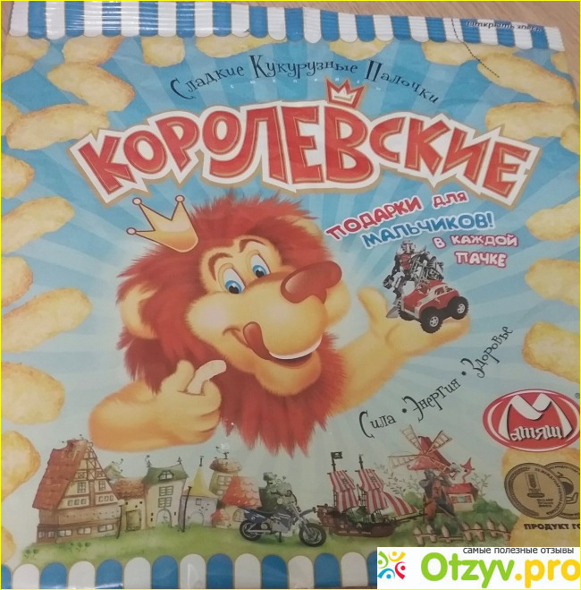Когда летом к нам в гости приехали дочь с зятем с 2 нашими внуками, то, конечно, нам с мужем хотелось как можно больше накупить разных вкусняшек и угостить нашего старшего малыша, которому исполнилось 3 года. Младшему внуку есть такие сладости еще рано. Одним из сладких сюрпризов были сладкие кукурузные палочки "Королевские". На упаковке было указано, что внутри пачки для мальчиков ждут подарки.