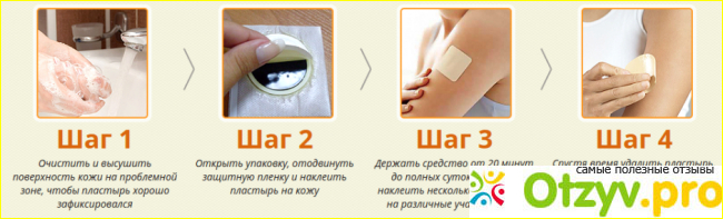 Далее требуется отсоединить защитную плёнку и аккуратно приклеить пластырь на проблемный участок тела.