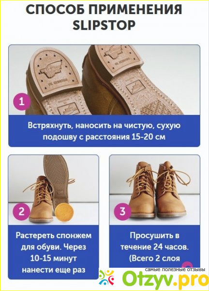 В сети можно ознакомиться с отзывами о средстве SlipStop. Все отклики которые я читала благоприятные. Изделие образует прочную защитную пленку, которая не стирается в течение всего дня. Также средство прекрасно сохраняет внешний вид обуви и защищает подошву от повреждений. Главное качество за которое СлипСтоп ценится потребителями – предохранение человека от падений.