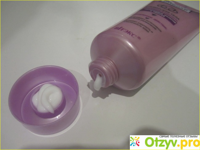 Упаковка ничем особым не примечательна, обычная туба, объемом 200мл, в сиреневых тонах. Крышка находится снизу тубы - поэтому средство можно хранить в вертикальном положении для удобства использования. Но тут отмечу один минус - крышку надо откручивать, это достаточно не удобно в сравнении со средствами, где крышка для открывания-закрывания просто отщелкивается одним движением. Само средство белого цвета, по консистенции жидкое, но текстура его очень нежная, за счет чего оно хорошо распределяется по коже и быстро впитывается.