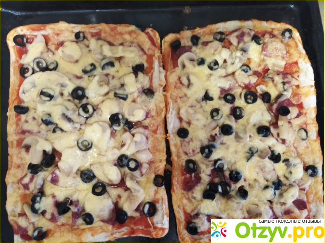 В итоге получилось очень вкусно! Вот такие две небольшие пиццы. Края не расклеились, тесто пропеклось. Эксперимент с новым тестом считаю удачным.
