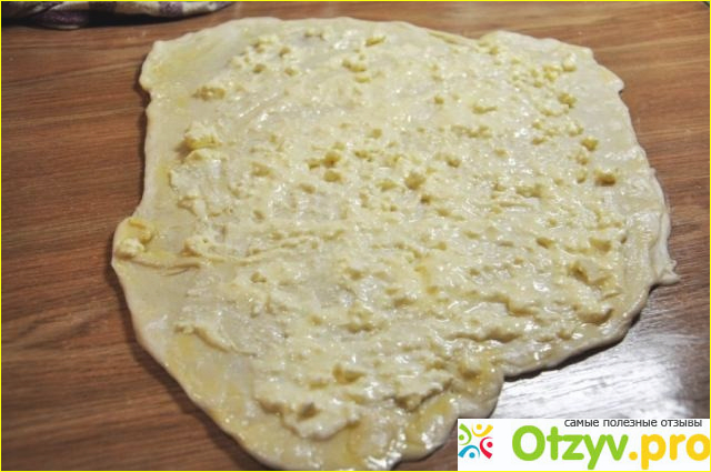 Теперь формируем пирог. В подготовленную смазанную маслом форму выкладываем наш первый слой теста, сверху часть нашей начинки(распределить нужно так чтоб хватило на весь пирог). Так чередуем до конца(тесто, сливочное масло, начинка), последним будет пласт теста смазанный маслом.