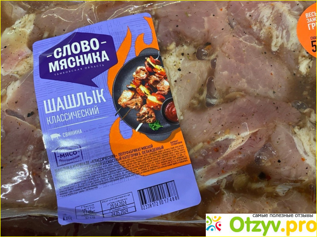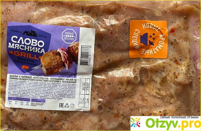 Жарится быстро, потому что куски не очень крупные. Пахнет все приятно. Упаковка тоже самое то для него, удобно брать такую с собой. Кусков сала не докладывают для веса, а что есть на кусочках, не срезаю. Так намного вкуснее и сочнее получается. Покупаем уже не первый раз, всегда свежий попадается. Идеальный вариант, если внезапно собрались на шашлыки, а мясо сами не замариновали. Продается в любом магазине, иногда даже скидки бывают на продукцию.