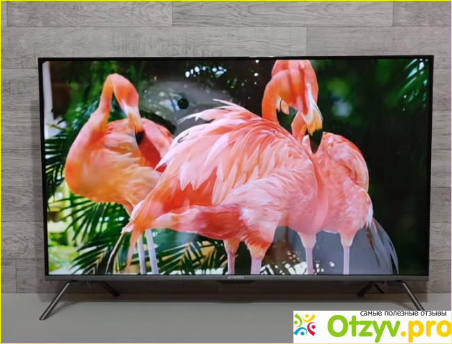 Выглядит телевизор очень презентабельно, с привлекательным внешним дизайном, у которого очень тонкие рамки по краям экрана. Сейчас многие телевизоры делает так, чтобы рамка была как можно меньше. К сожалению, ещё не научились делать совсем без неё, но уже минимизировали максимально. Вообще эта серия имеет наименование «Boundless Vision», что как раз и подразумевает дизайн практически без рамок. По периметру пластиковая рамка немножко видна, а внизу чуть толще. Также есть небольшое утолщение, на котором располагается светодиодная индикация и наименование компании.
