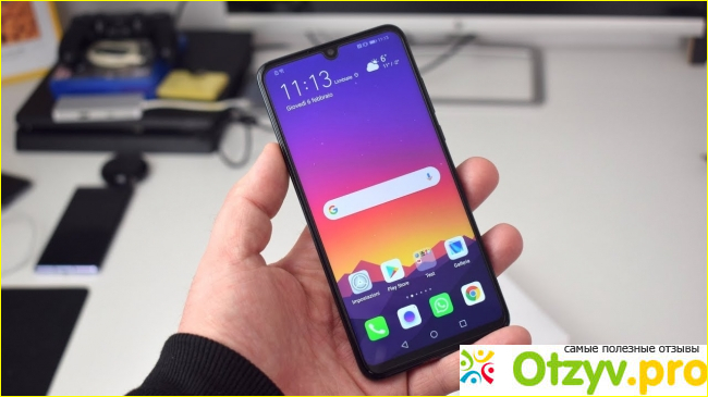 Корпус смартфона сделан отлично, он не скрипит и не люфтит. По ощущениям довольно приятный, задняя поверхность - это стекло с зеркальной подложкой имеющий градиентные расцветки. При солнечных лучах он очень красиво переливается. В руке сидит отлично, не тяжелый, весит всего 159 г, довольно тонкий, диагональ дисплея составляет 6.15 дюймов. На передней панеле есть каплевидный вырез под фронтальную камеру.