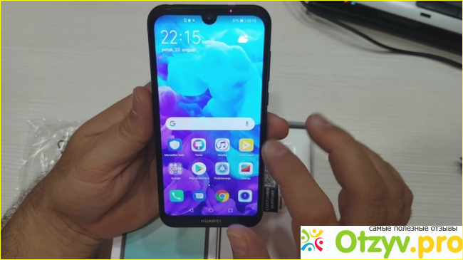 Благодаря отделке из искусственной кожи смартфон выглядит так, как будто он немного на премиальной стороне спектра. На этом смартфоне нет плохой конструкции корпуса; держа его в руках, Y5 2019 чувствует себя стабильно, но удивительно легко. Закругленные углы устройства обеспечивают удобное прилегание к ладони. Толстые рамки окружают дисплей. Нижняя рамка довольно здоровенная, на ней нанесен логотип Huawei. Верхняя лицевая панель по сравнению с ней тоньше, а там, где расположена фронтальная камера, есть углубление в виде капли росы.