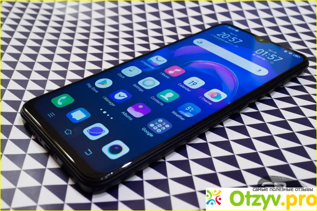 Я бы не сказала, что дизайн телефона VIVO Y 19 обладает чем-то уникальным или сверхпрекрасным, он даже не выделяется никакими дизайнерскими решениями, все абсолютно спокойно, простенько, такое ощущение, что создатели не хотели выпячиваться и избегали необычных элементов и вычурности. Конечно оформление на любителя, мне скорее по душе иные дизайнерские задумки, однако что привлекло внимание, так это немного веселое цветовое решение. Что это обозначает? Мне например достался телефон в черной расцветке, тыльная крышка которой играет переливами под лучами солнца, отливается голубыми волнами, создается эффект градиентных переливов, собственная маленькая радуга в ладони. Однако к этой красоте можно добавить ложку дегтя, поверхность корпуса чрезмерно маркая, поэтому следы от пальцев остаются надолго и некрасиво.